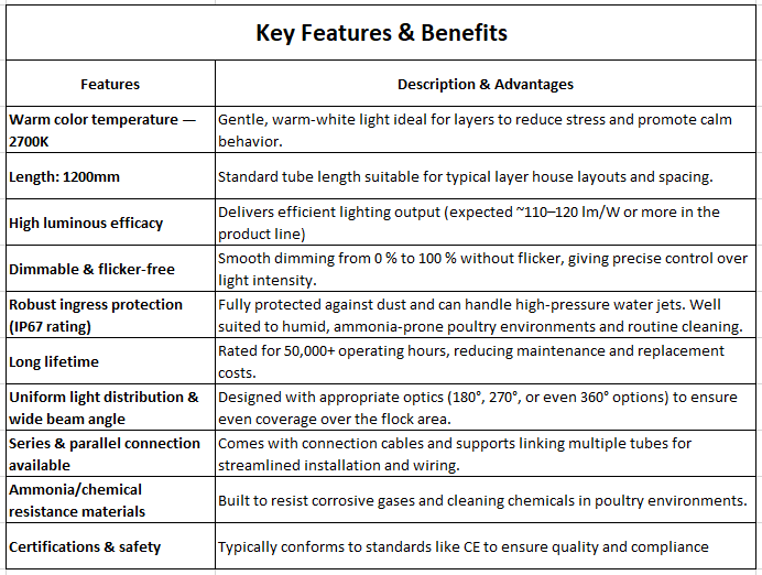 Flick-free LED tube catering for layers (egg-producing) poultry houses.